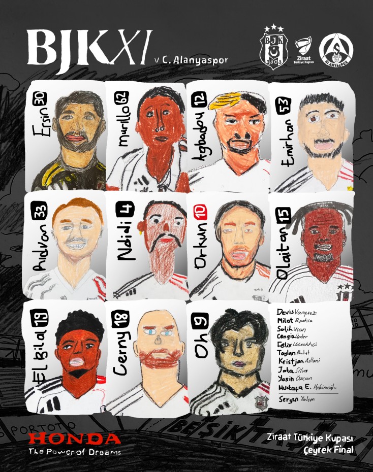 Beşiktaş: Ersin, Ndidi, Oh, Kökçü, Agabadou, Olatitan, Cerny, Toure, Rıdvan, Emirhan, Murillo