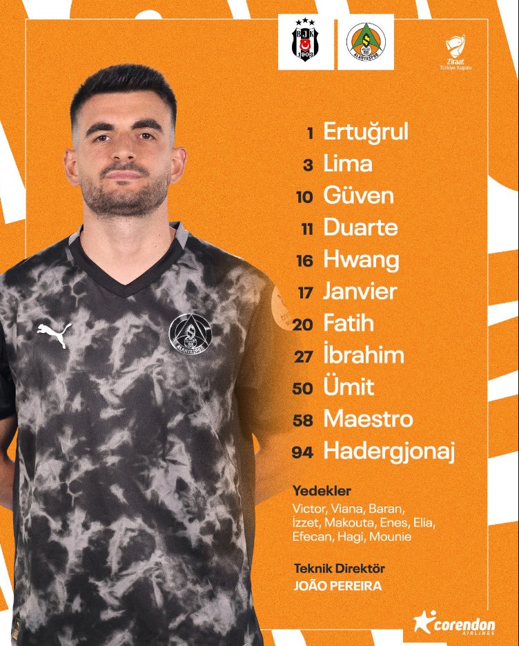 Alanyaspor: Ertuğrul, Lima, Güven, Duarte, Hwang, Janvier, Fatih, İbrahim, Ümit, Maestro, Hadergjonaj