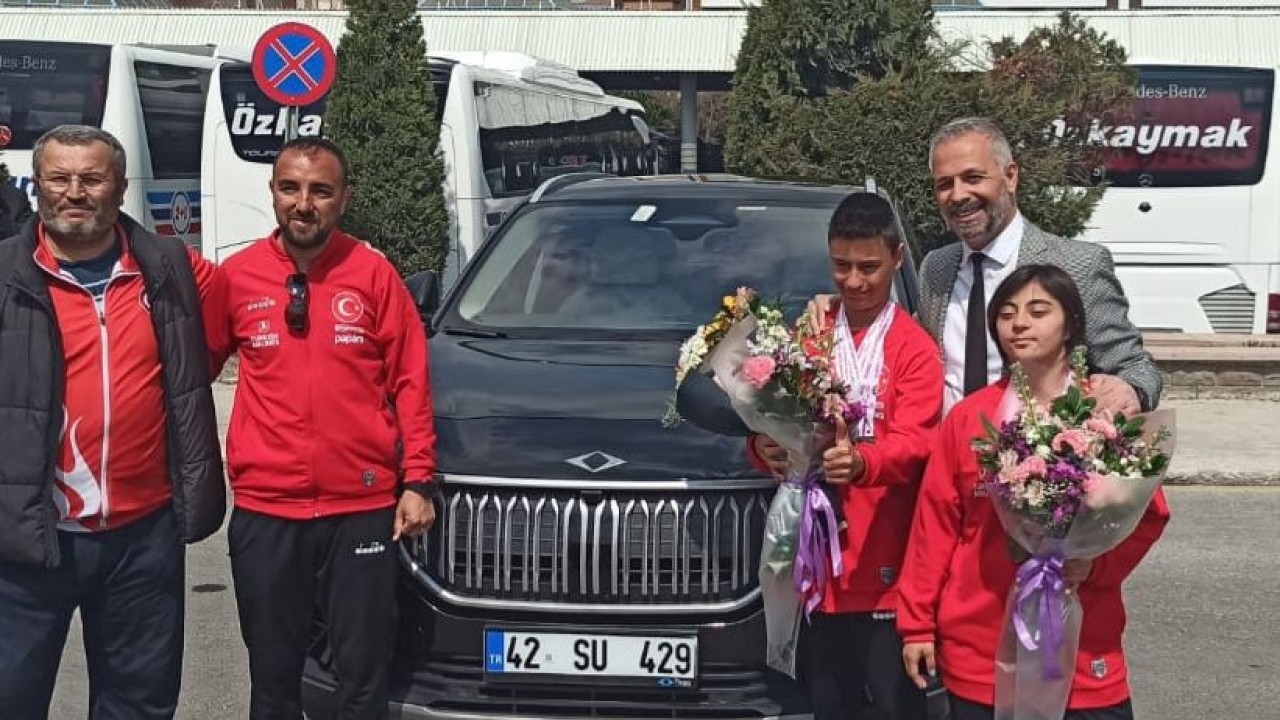 Atletizm milli takımında yer alan Muhammed Eren Uysal ve Berfin Yılmaz Atletizm Milli Takımımızın Dünya Şampiyonu olmasında önemli rol oynamıştı. Muhammed Eren Uysal 800 ve bin 500 metre yürüyüş altın madalya kazanırken; bin 500 metre koşuda ise dünya rekoru kırarak altın madalyanın sahibi olmuştu. Berfin Yılmaz ise T21 kategorisinde bin 500 metre yürüyüş gümüş madalya kazanmıştı. Konya'da büyük bir coşkuyla karşılanan başarılı sporcular, madalyaları TOGG ile Konya turu yaparak kutladı. (Hasan Yıldırım)