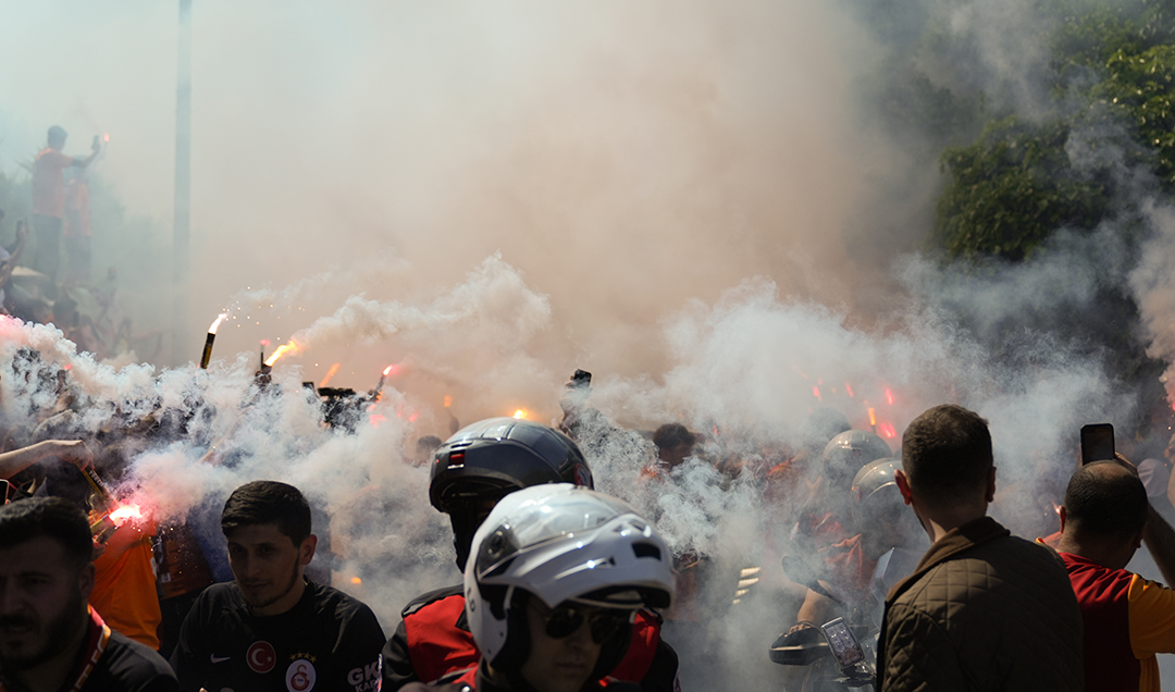 Tesislerin önünde bayrakları açan ve meşaleler yakan taraftarlar, oyunculara tezahüratlarla destek verdi.