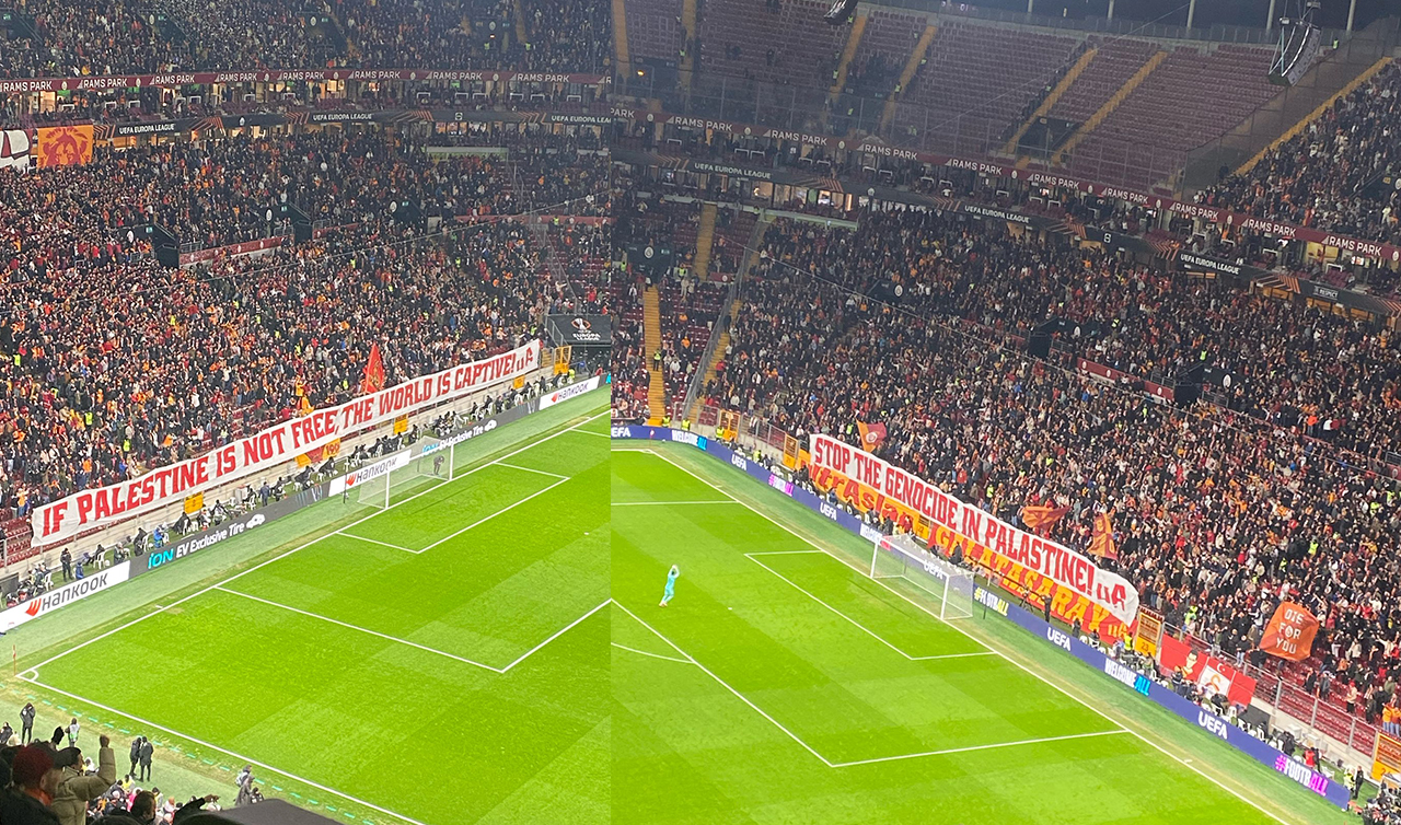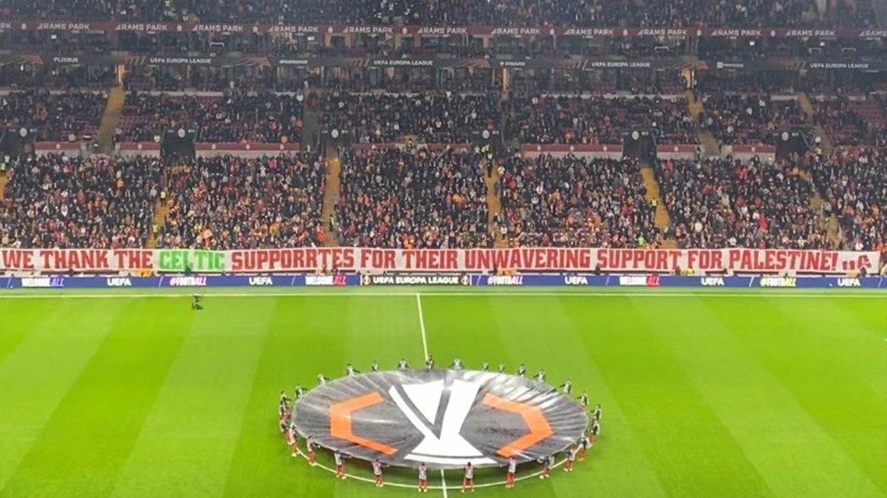 İskoçya ekibi Celtic’in taraftarları hemen hemen tüm karşılaşmalarında yaptıkları koreografi ve oluşturdukları tribün ambiyanslarıyla İsrail’in işgali altındaki Filistin’e destek mesajları veriyordu. Galatasaray taraftarları da AZ Alkmaar maçında Doğu Tribünü’nde açtıkları pankartlarla Celtic taraftarlarına teşekkür etti. Sarı-kırmızılı taraftarlar, Doğu Tribünü’nde açılan pankartta, “Filistin’e olan sarsılmaz destekleri için Celtic taraftarlarına teşekkür ediyoruz” ifadelerine yer verdi. Ayrıca kale arkasında yer alan tribünlerde de ‘Filistin’deki soykırımı durdurun’ ve ‘Filistin özgür değilse, dünya tutsaktır’ yazılı pankartlara yer verildi.