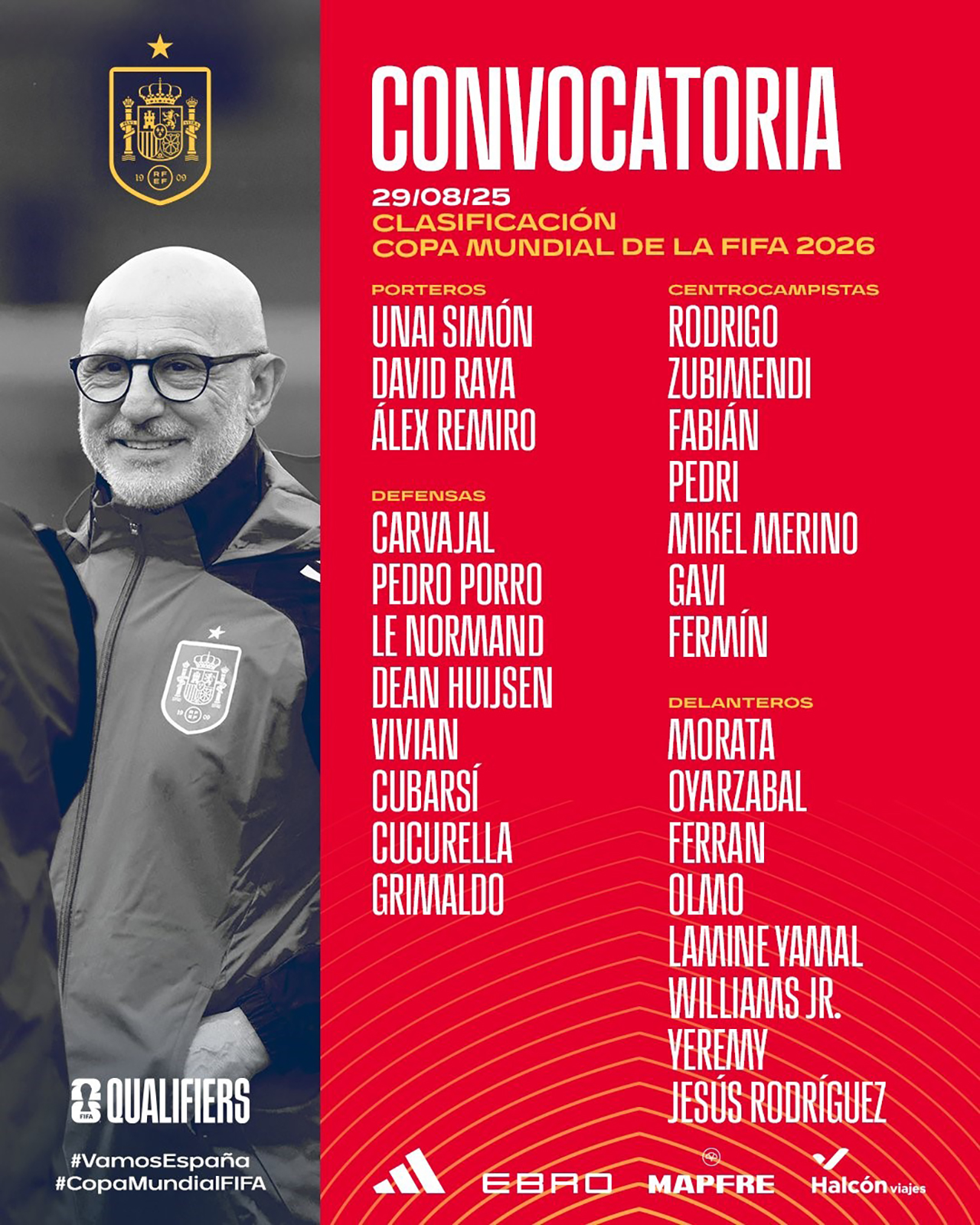 Forvet: Alvaro Morata (Como 1907), Mikel Oyarzabal (Real Sociedad), Ferran Torres (Barcelona), Dani Olmo (Barcelona), Lamine Yamal (Barcelona), Nico Williams (Athletic Club), Yeremy Pino (Villarreal), Jesus Rodriguez (Como 1907)