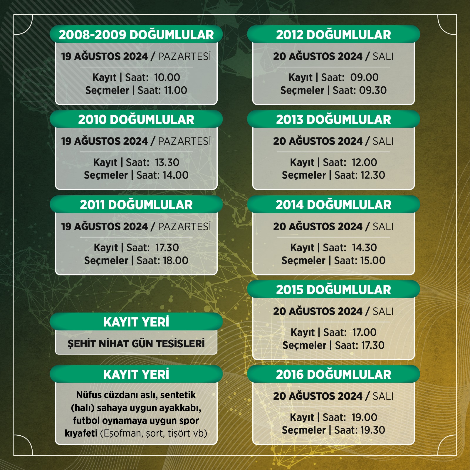 Seçmelerin yapılacağı tarihler ise şöyle: 2008-2009 doğumlular için kayıtlar 19 Ağustos Pazartesi günü saat: 10:00’da yapılacak. Seçmeler ise 11:00’da. 2010 doğumlular için kayıtlar 19 Ağustos Pazartesi günü saat: 13:30’da yapılacak. Seçmeler ise 14:00’da. 2011 doğumlular için kayıtlar 19 Ağustos Pazartesi günü saat: 17:30’da yapılacak. Seçmeler ise 18:00’da. 2012 doğumlular için kayıtlar 20 Ağustos Salı günü saat: 09:00’da yapılacak. Seçmeler ise 09:30’da. 2013 doğumlular için kayıtlar 20 Ağustos Salı günü saat: 12:00’da yapılacak. Seçmeler ise 12:30’da. 2014 doğumlular için kayıtlar 20 Ağustos Salı günü saat: 14:30’da yapılacak. Seçmeler ise 15:00’da. 2015 doğumlular için kayıtlar 20 Ağustos Salı günü saat: 17:00’da yapılacak. Seçmeler ise 17:30’da. 2016 doğumlular için kayıtlar 20 Ağustos Salı günü saat: 19:00’da yapılacak. Seçmeler ise 19:30’da.