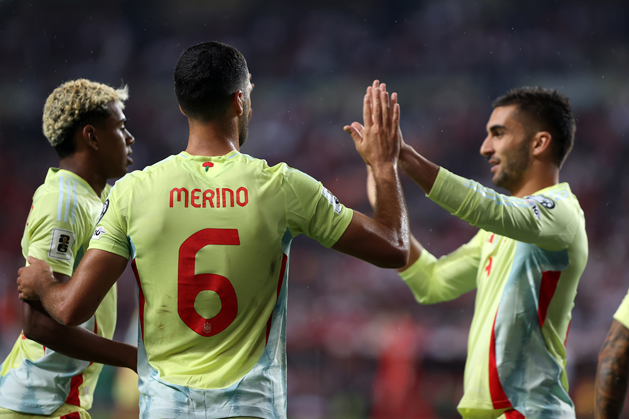 58. dakikada İspanya farkı 5'e çıkardı. Yamal'ın pasıyla topu kontrol eden Merino, ceza sahası dışından sert şutunda meşin yuvarlağı filelere yolladı: 0-5