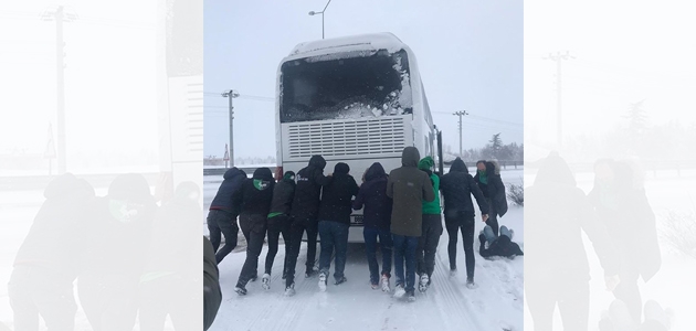 Konyaspor-Denizlispor maçına giden ‘Yeşil Cephe’ taraftar grubunu taşıyan otobüs, yoğun kar nedeniyle Alaşehir’de yolda kaldı. Taraftarlar maça yetişmek için otobüsü girdiği kar birikintisinden ittirerek çıkardı.