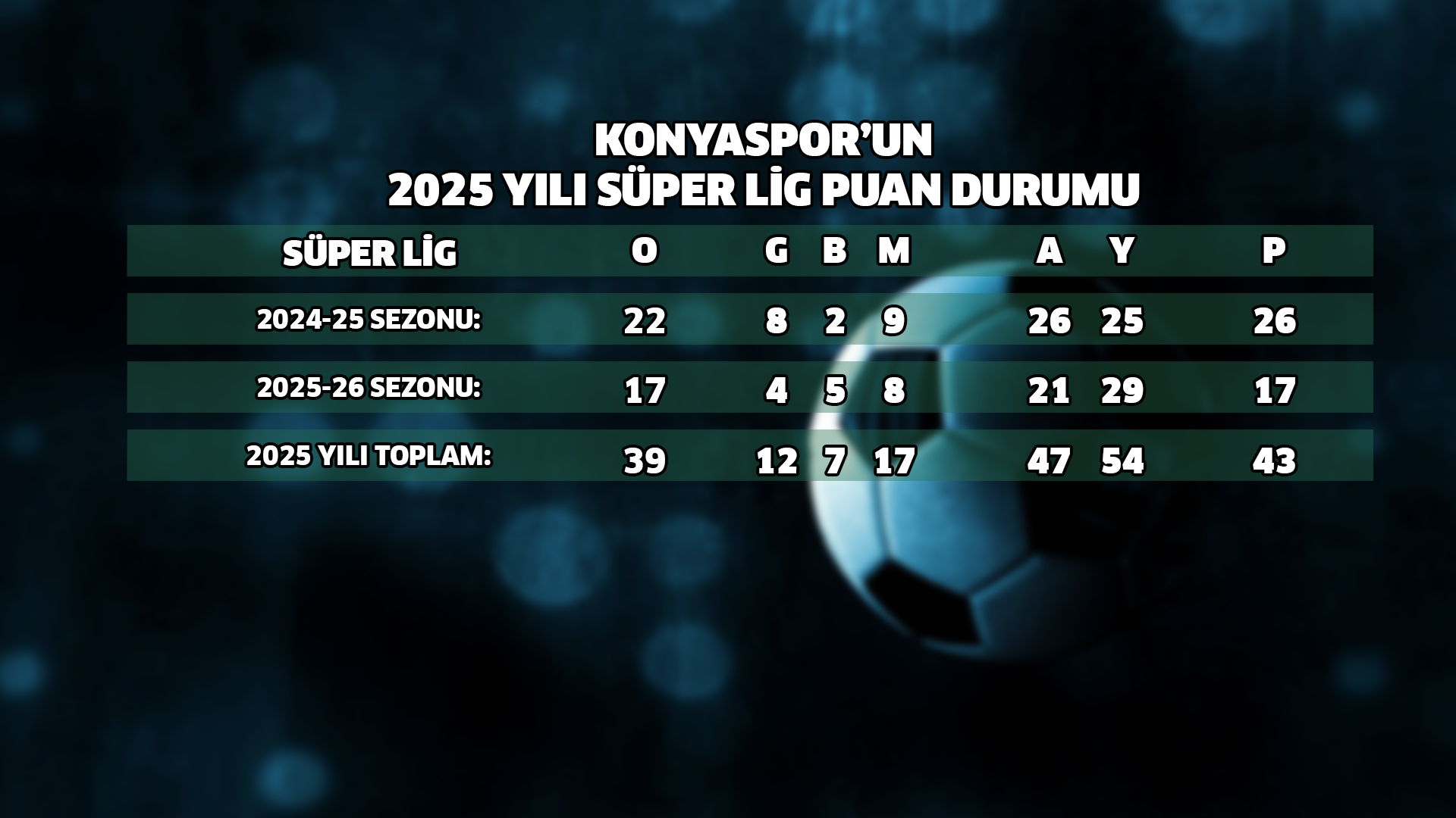 Konyaspor, 2025 yılında Süper Lig’de tam 39 maça çıktı. Yeşil-beyazlılar bahse konu periyottan 12 galibiyet, 7 beraberlik ve 17 mağlubiyet aldı. Rakiplerine karşı 47 kez gol sevinci yaşayan Anadolu Kartalı, filelerinde ise 54 gol gördü. Konyaspor bu süreçte ise hanesine 43 puan yazdırdı.