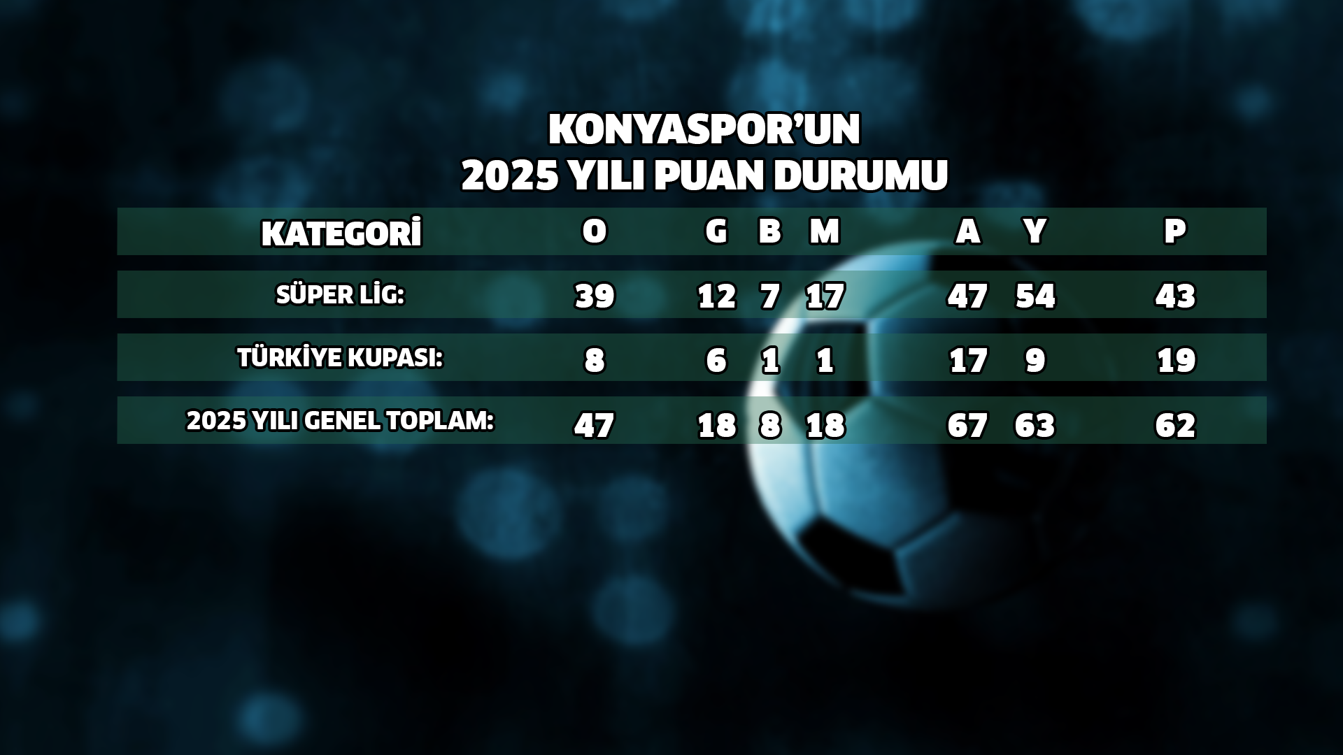 Konyaspor, gerek Süper Lig gerekse Türkiye Kupası olmak üzere 2025 yılında toplam 47 maça çıktı. Yeşil-beyazlılar bu süreçte 18 galibiyet, 8 beraberlik ve 18 mağlubiyet elde etti. Anadolu Kartalı rakiplerine karşı 64 kez gol sevinci yaşarken, ağlarında ise 63 gol gördü. Konyaspor, bu süreçte ise hanesine 62 puan yazdırarak maç başına 0,7 puan topladı. (Büşra Üstündağ)