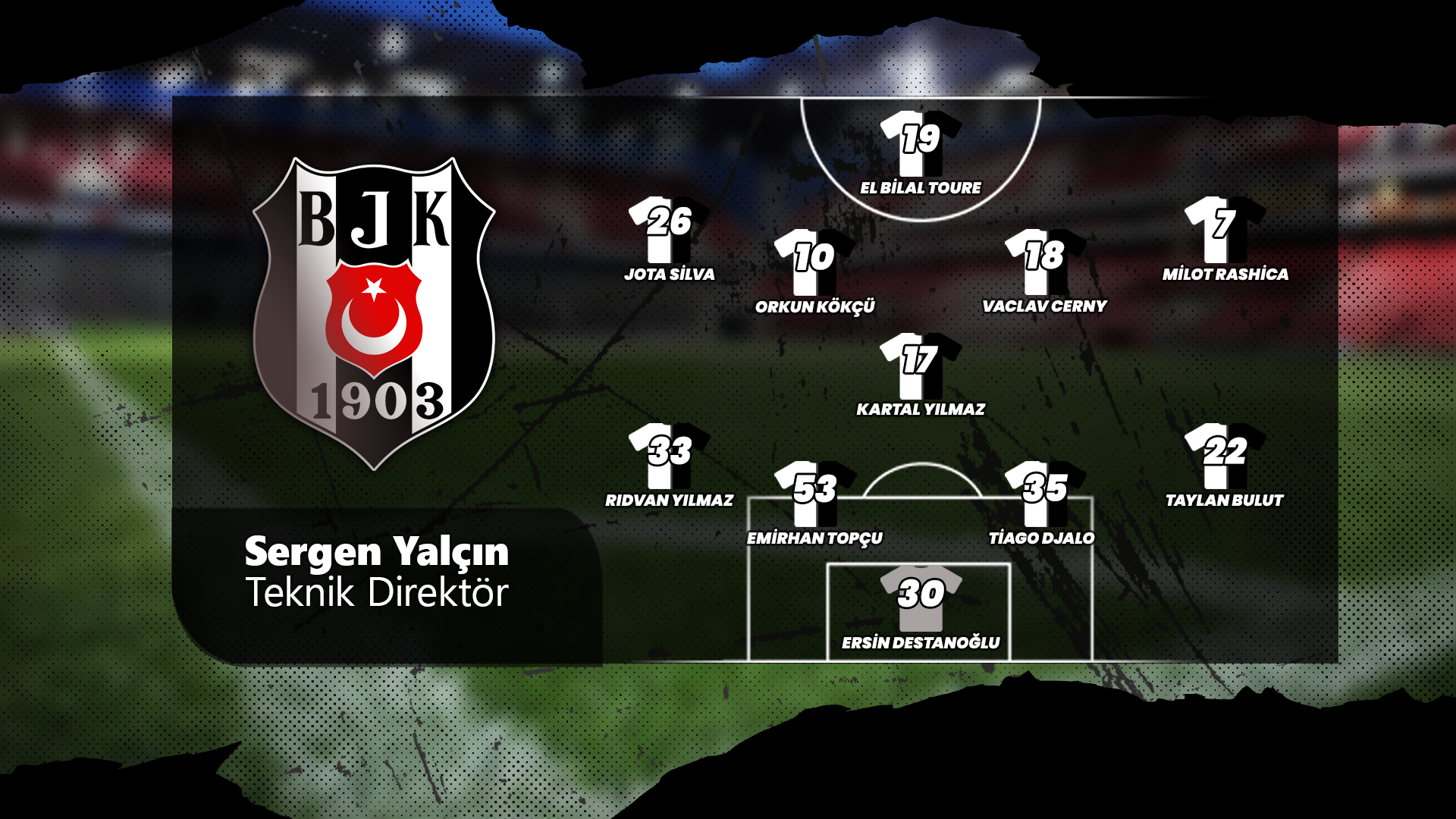 Teknik direktör Sergen Yalçın nezaretinde 4-1-4-1 dizilişiyle mücadele eden Beşiktaş’ın; Konyaspor’a karşı da aynı diziliş ve oyun anlayışıyla sahada yer alması bekleniyor. Siyah-beyazlı ekibin kalesinde Ersin Destanoğlu (30), savunma 4’lüsünde Taylan Bulut (22), Tiago Djalo (35), Emirhan Topçu (53) ve Rıdvan Yılmaz (33), tekli ön liberoda Kartal Yılmaz (17)i 4’lü orta alanda Milot Rashica (7), Vaclav Cerny (18), Orkun Kökçü (10) ve Jota Silva (26), tekli ileri uçta ise El Bilal Toure’nin (19) forma giymesi bekleniyor.