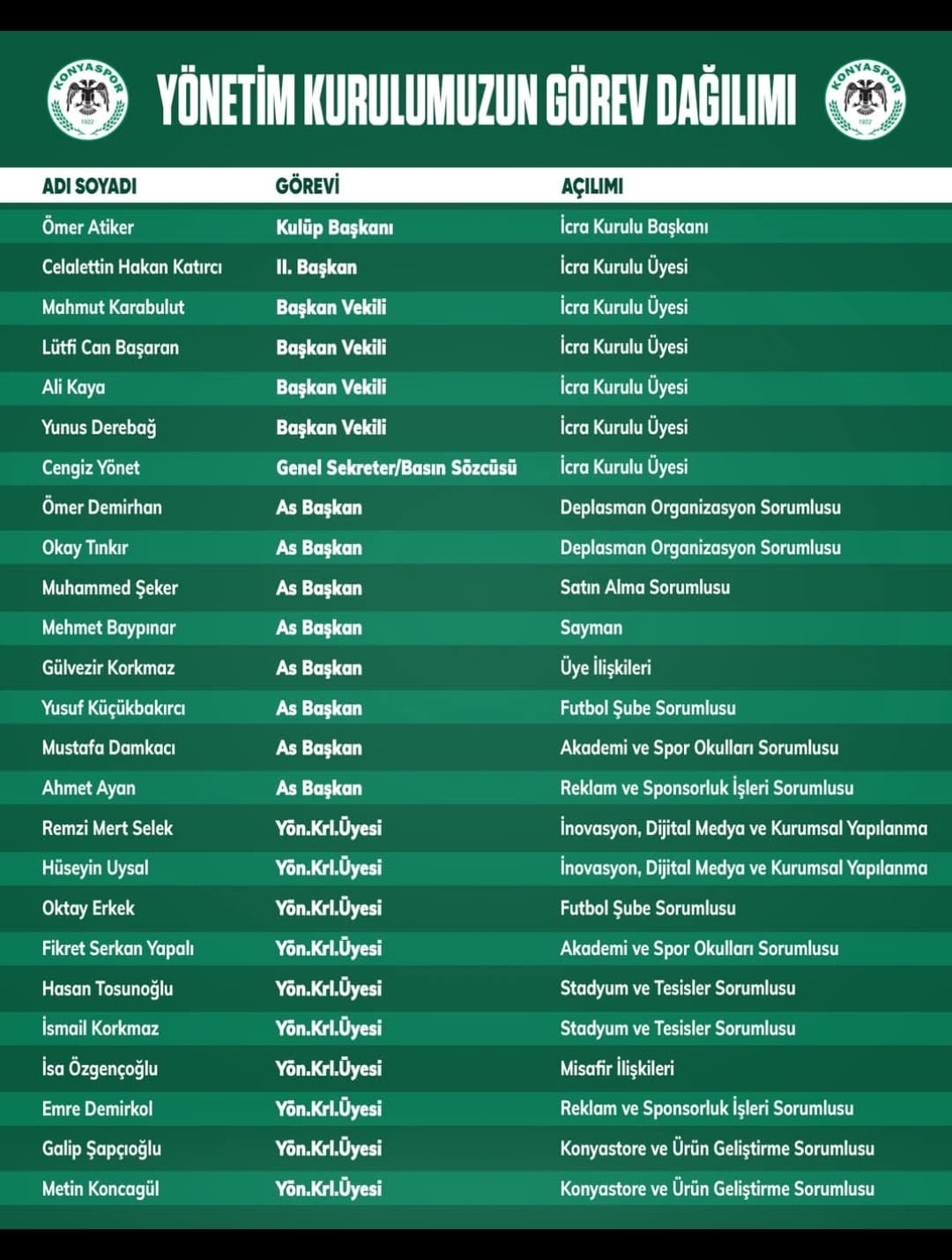 Konyaspor yeni görev dağılımında, teknik direktör ve antrenörlerin yanı sıra altyapı koordinatörlüğü, iletişim, pazarlama ve mali işler gibi bölümlerde de önemli atamalar yapıldı. Kulüp, hem saha içinde hem saha dışında daha organize bir yapıya kavuşmayı amaçlıyor.