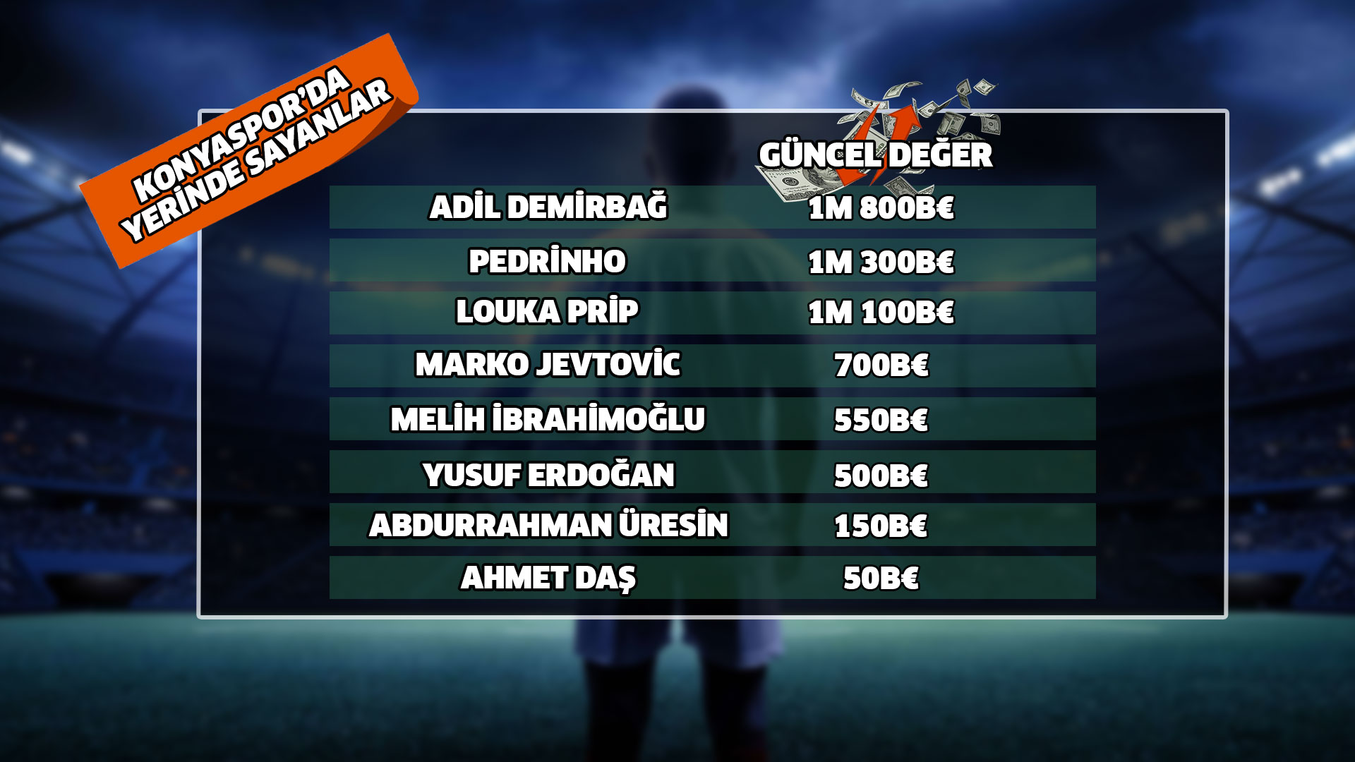 Tümosan Konyaspor’da 8 oyuncu ise yerinde saydı. Anadolu Kartalı’nda Adil Demirbağ 1 milyon 800 bin, Pedrinho 1 milyon 300 bin, Louka Prip 1 milyon 100 bin, Marko Jevtovic 700 bin, Melih İbrahimoğlu 550 bin, Yusuf Erdoğan 500 bin, Abdurrahman Üresin 150 bin ve Ahmet Daş 50 bin Euro’luk değerini korudu.