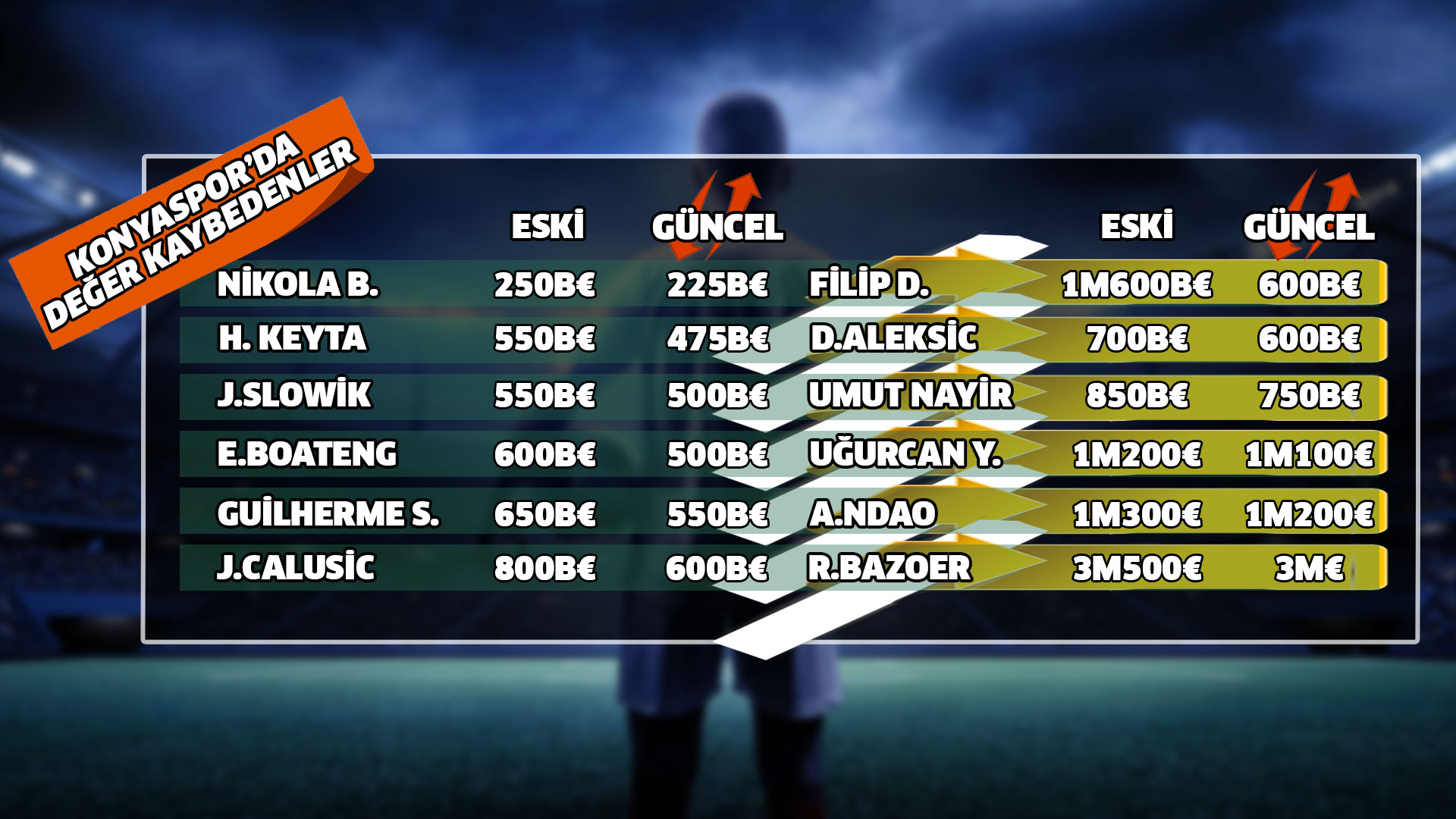 Anadolu Kartalı’nda 12 oyuncu ise değer kaybetti. Yeşil-beyazlı takımda Nikola Boranijasevic 250 binden 225 bine, Hamidou Keyta 550 binden 475 bine, Jakub Slowik 550 binden 500 bine, Emmanuel Boateng 600 binden 500 bine, Guilherme Sitya 650 binden 550 bine, Josip Calusic 800 binden 600 bine, Filip Damjanovic 1 milyondan 600 bine, Danijel Aleksic 700 binden 600 bine, Umut Nayir 850 binden 750 bine, Uğurcan Yazğılı 1 milyon 200 binden 1 milyon 100 bine, Alassane Ndao 1 milyon 300 binden 1 milyon 200 bine ve Riechedly Bazoer 3 milyon 500 bin Euro’dan 3 milyon Euro’ya düştü.