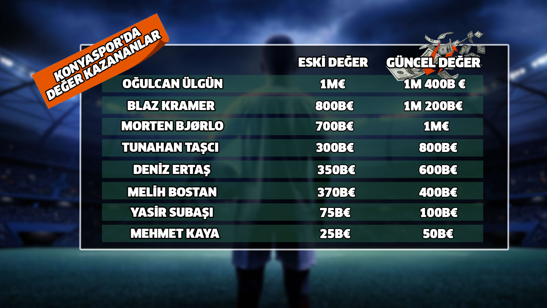 Tümosan Konyaspor’da 8 oyuncu değer kazandı. Anadolu Kartalı’nda Oğulcan Ülgün 1 milyondan 1 milyon 400 bine, Blaz Kramer 800 binden 1 milyon 200 bine, Morten Bjørlo 700 binden 1 milyona, Tunahan Taşcı 300 binden 800 bine, Deniz Ertaş 350 binden 650 bine, Melih Bostan 375 binden 400 bine, Yasir Subaşı 75 binden 100 bine ve Mehmet Kaya ise 25 bin Euro’dan 50 bin Euro’ya yükseldi.