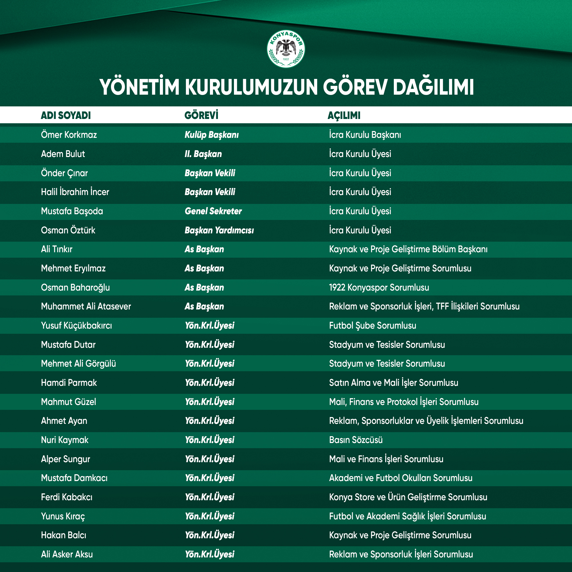 Alınan son bilgiler doğrultusunda Konyaspor Kulübü'nde Yönetim Kurulu'nda görev dağılımı belli oldu.