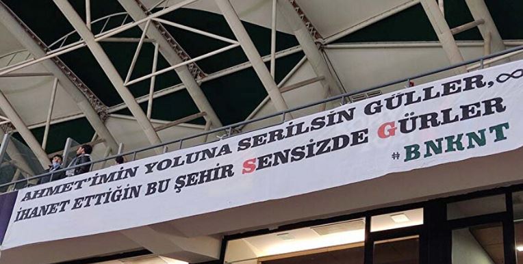Pankartta, “"Ahmet'imin yoluna serilsin güller. İhanet ettiğin bu şehir sensiz de gürler" ifadeleri yer alıyordu.