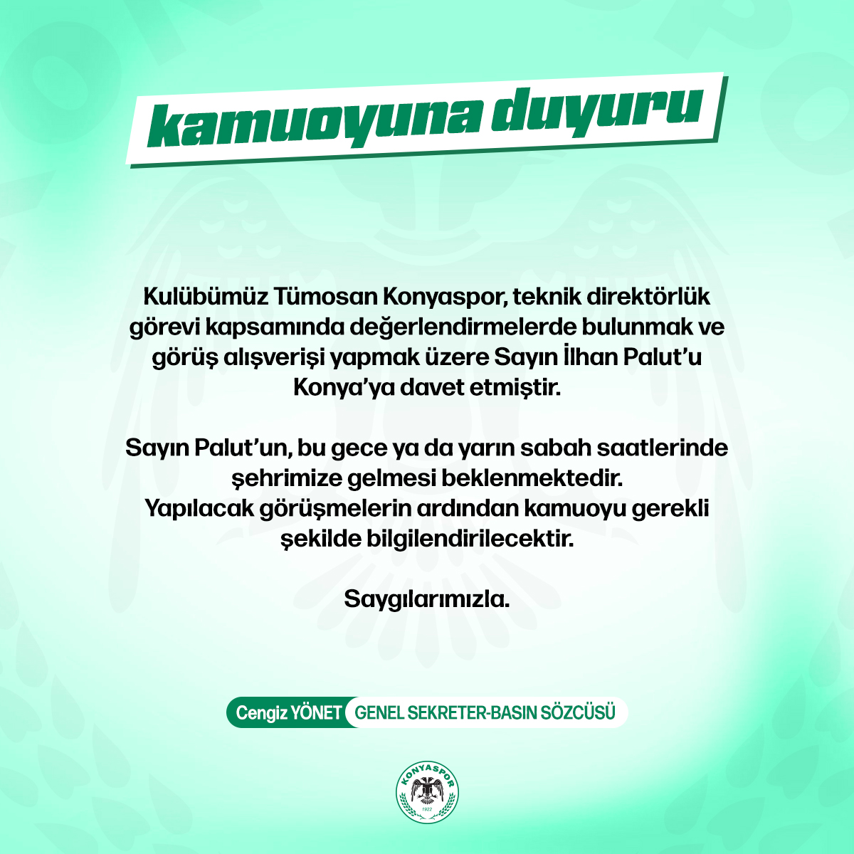 Konyaspor'dan yapılan açıklamada, "Kulübümüz Tümosan Konyaspor, teknik direktörlük görevi kapsamında değerlendirmelerde bulunmak ve görüş alışverişi yapmak üzere Sayın İlhan Palut’u Konya’ya davet etmiştir. Sayın Palut’un, bu gece ya da yarın sabah saatlerinde şehrimize gelmesi beklenmektedir. Yapılacak görüşmelerin ardından kamuoyu gerekli şekilde bilgilendirilecektir. Saygılarımızla" denildi. (Büşra Üstündağ)
