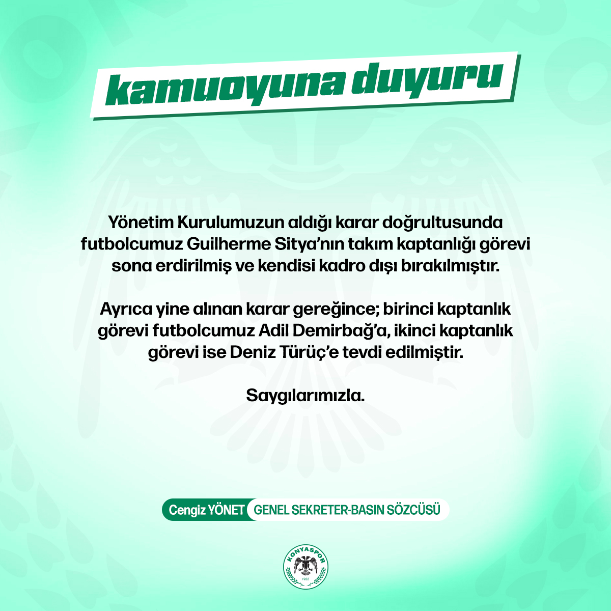 Konyaspor yönetimi, takım kaptanlarından Guilherme Sitya’nın kaptanlık görevine son verdiğini ve oyuncunun kadro dışı bırakıldığını açıkladı.