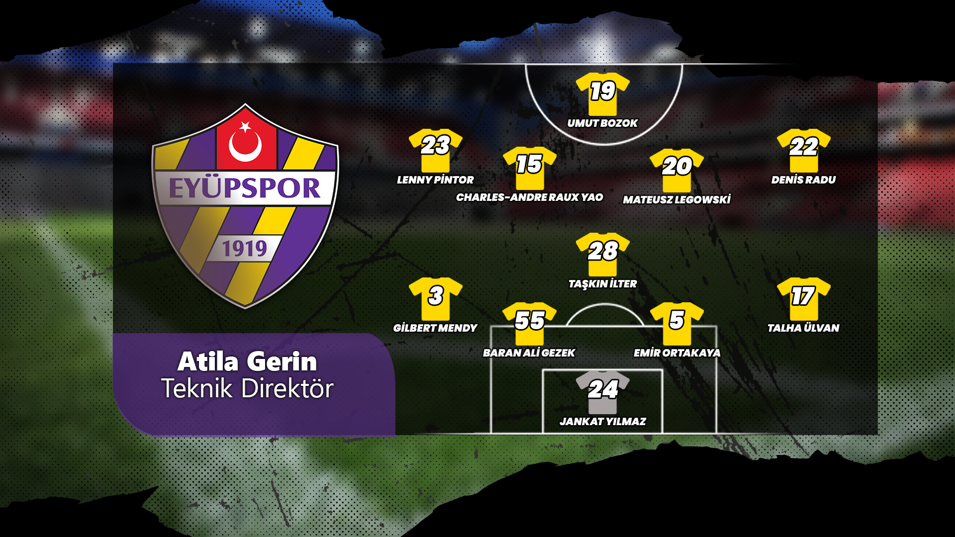 Teknik direktör Atila Gerin nezaretinde 4-1-4-1 sistemiyle mücadele eden Eyüpspor’un; Konyaspor’a karşı da aynı diziliş ve oyun anlayışıyla sahada yer alması bekleniyor. Eflatun-sarılıların kalesinde Jankat Yılmaz (24), savunma 4’lüsünde Talha Ülvan (17), Emir Ortakaya (5), Baran Ali Gezek (55) ve Gilbert Mendy (3), tekli ön liberoda Taşkın İlter (28), 4’lü orta alanda Denis Radu (22), Mateusz Legowski (20), Charles-Andre Raux Yao (15) ve Lenny Pintor (23), ileri uçta ise Umut Bozok’un (19) forma giymesi bekleniyor. (Büşra Üstündağ)