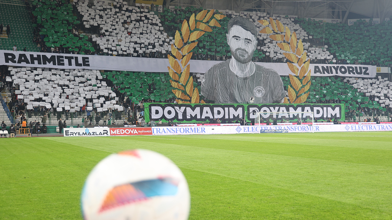 Konyasporlu taraftarlar tarafından ise kale arkası tribününde “Doymadım Doyamadım” yazılı Ahmet Çalık pankartıyla koreografi yapıldı.