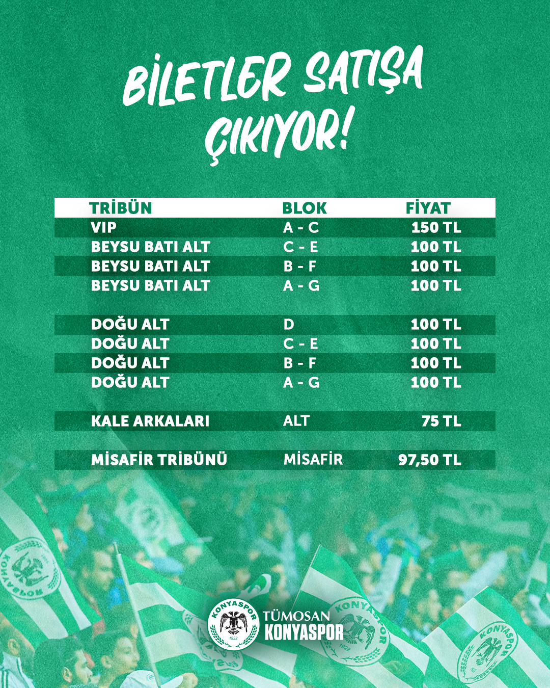 18 Ocak Perşembe günü saat 17.00’de MEDAŞ Konya Büyükşehir Stadyumu'nda oynanacak maçın biletleri satışa çıkıyor. Karşılaşmanın biletleri, 16 Ocak Salı günü (yarın) saat 11.00 itibarıyla satışa sunulacak.