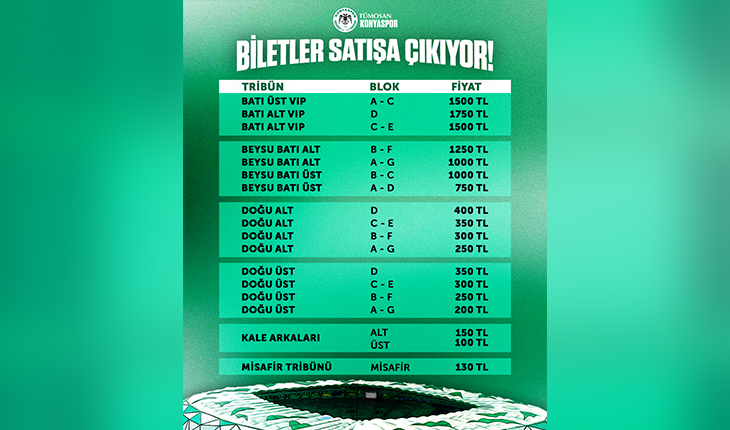 Karşılaşmanın biletleri http://passo.com.tr ve Passo gişelerinden alınabilirken, Konyaspor - Hatayspor mücadelesinin bilet fiyatları ise şu şekilde;