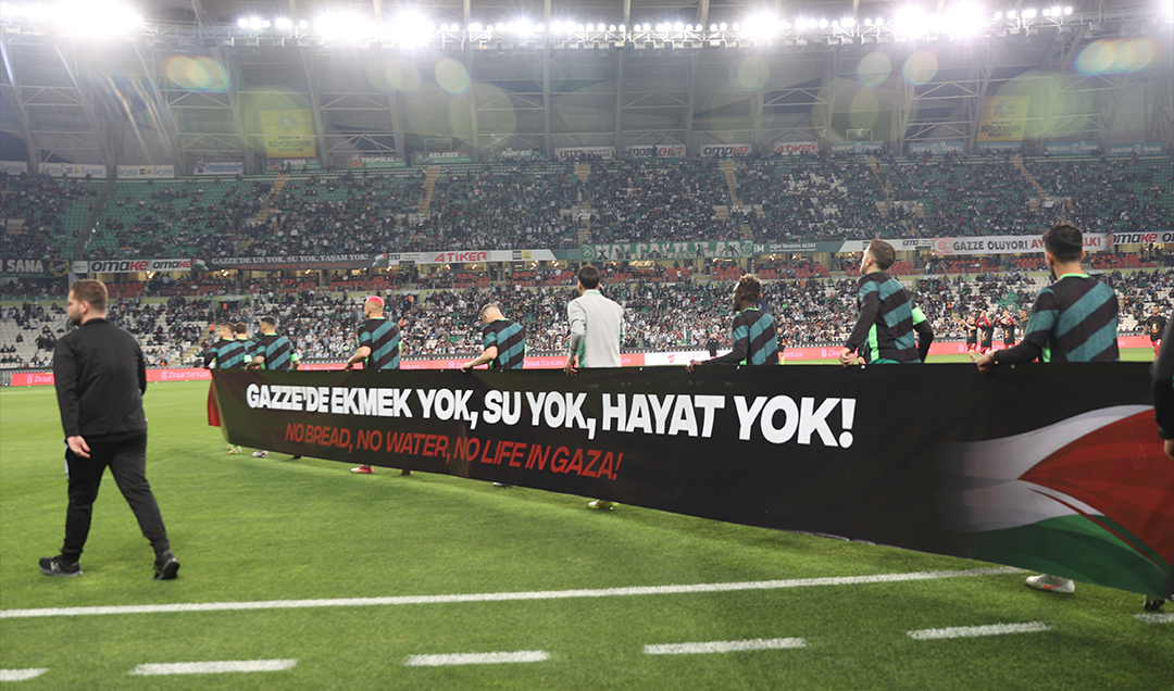 Mücadele öncesi yapılan seremonide anlamlı organizasyona imza atıldı. Filistin'e destek için Gazzeli çocuklar futbolcularla birlikte seremoniye çıktı. Çocukların giydikleri tişörtlerde Gazze için mesajlar yazıldığı görüldü. Yeşil-beyazlı futbolcular ısınmaya ise, "Gazze'de ekmek yok, su yok, hayat yok!" pankartıyla çıktı. Ayrıca seremoniye aralarında saldırıda yaralananların da bulunduğu Gazzeli 5 çocuk çıktı.