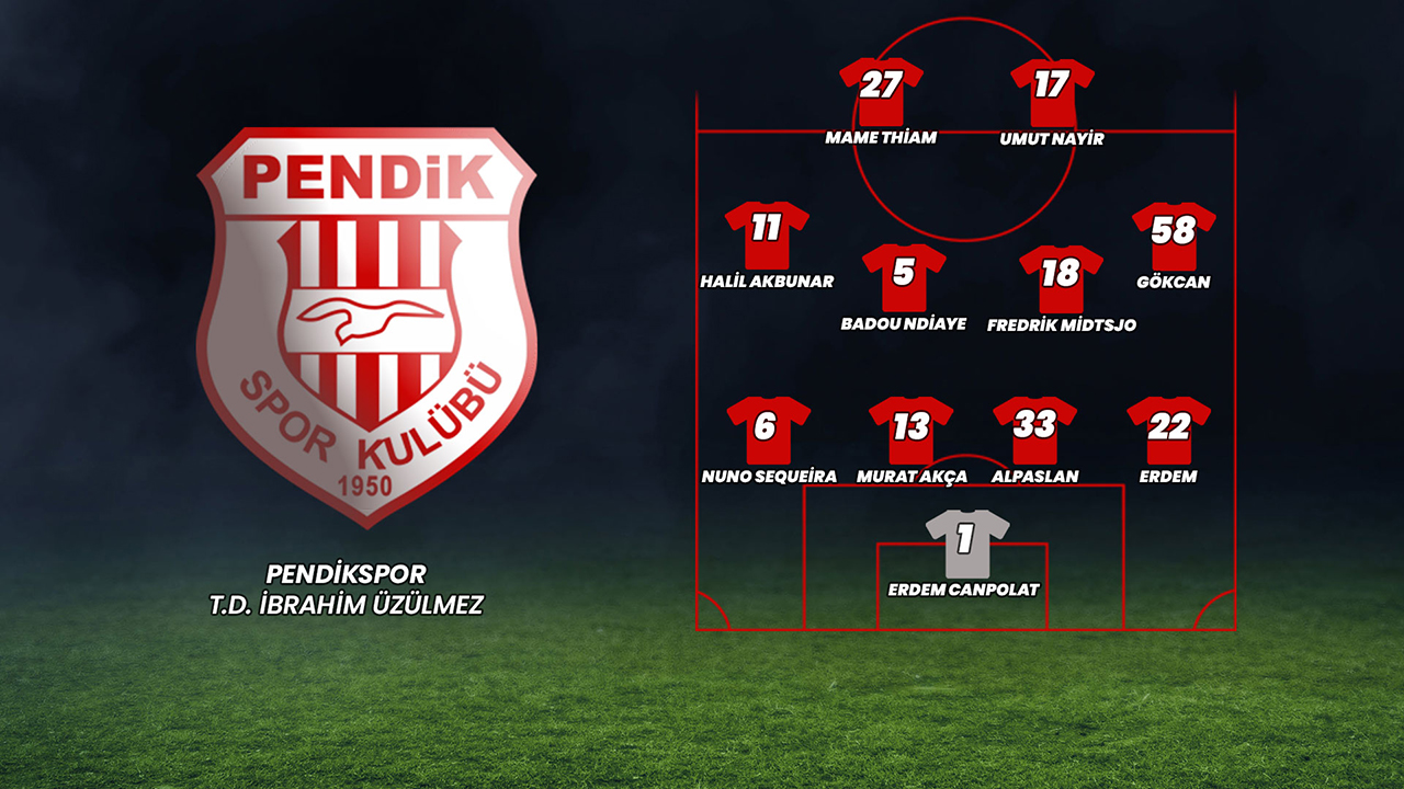 Hafta içinde Portekizli çalıştırıcı Ivo Vieira’nın yerine Pendikspor’un teknik direktörlük koltuğuna oturan İbrahim Üzülmez, İstanbul ekibiyle ilk maçına çıkacak. Pendik ekibinin 4-4-2 sistemiyle sahaya çıkması beklenirken; kalede Erdem Canpolat (1), savunma 4’lüsünde Erdem Özgenç (22), Alpaslan Öztürk (33), Murat Akça (13) ve Nuno Sequeira (6), orta 4’lüde Gökcan Kaya (58), Fredrik Midtsjo (18), Badou Ndiaye (5) ve Halil Akbunar (11), 2’li forvette ise Umut Nayir (17) ve Mame Thiam’ın (27) görev alması bekleniyor.