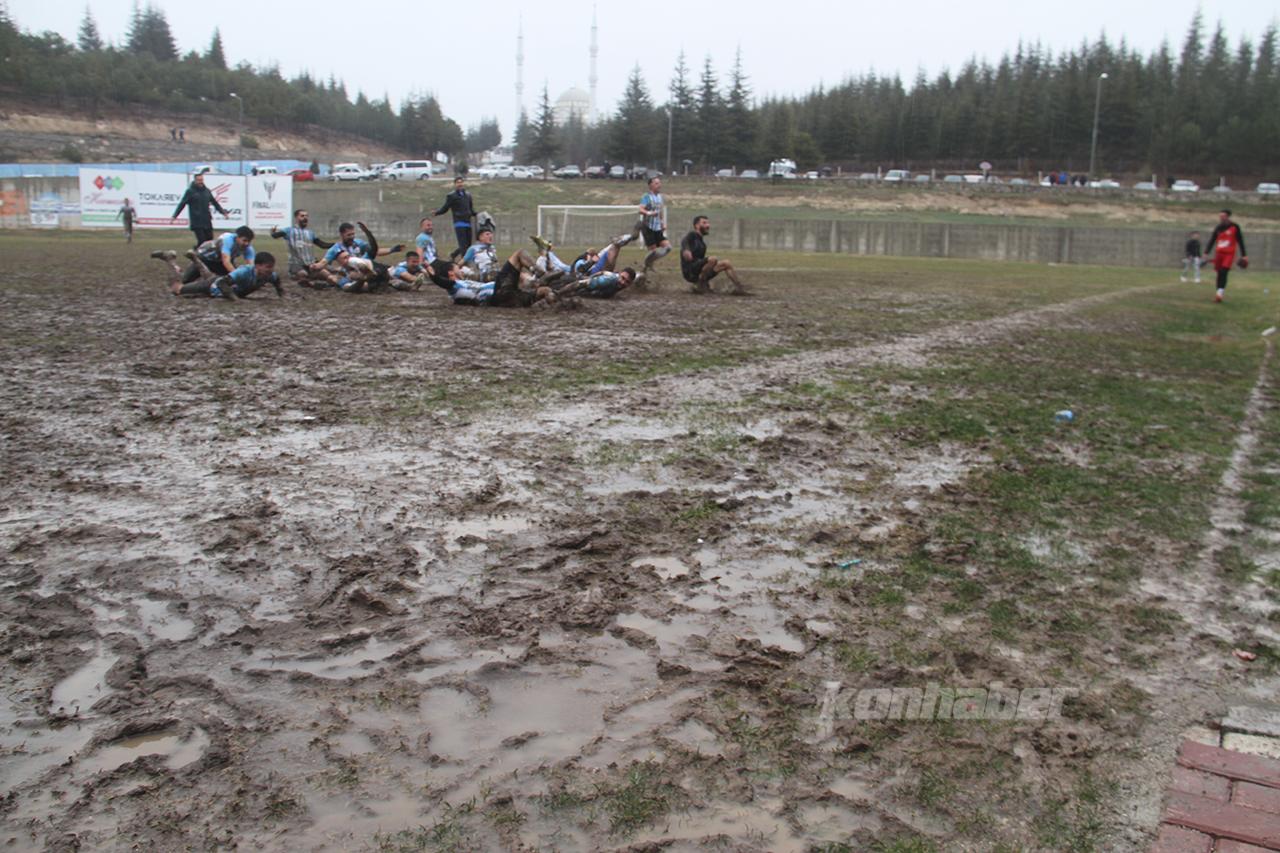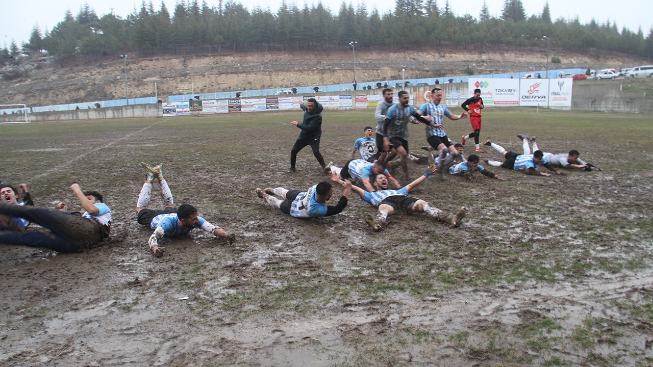 Beyşehir'de oynanan amatör lig mücadelesinde ligin bitmesine iki hafta kala Gerezspor'u yenerek şampiyonluğu garantileyen ev sahibi Beyşehir Belediyespor Futbol Kulübü oyuncuları, çamurlu zemine yatarak galibiyeti kutladı.