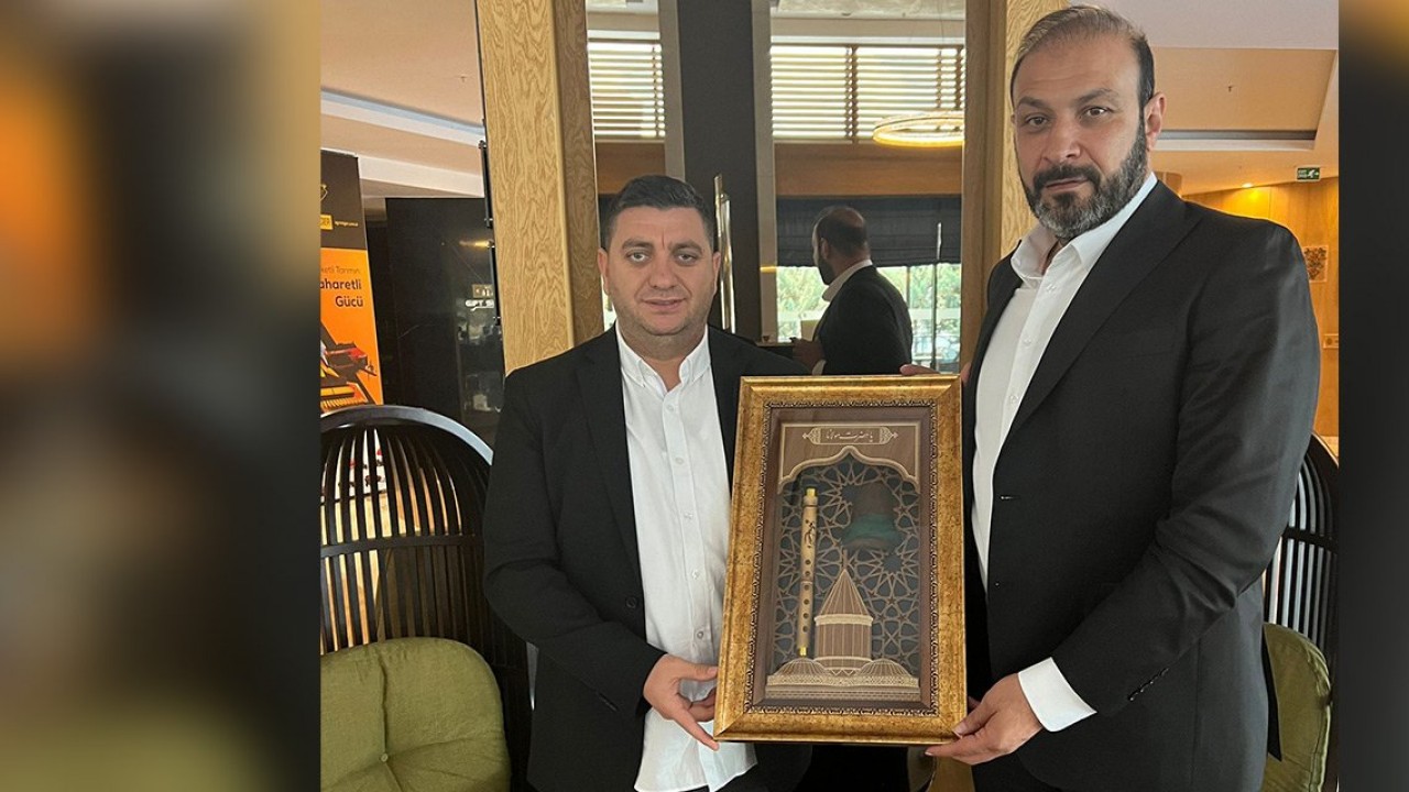 İş adamı Osman Öztürk, Başkan Haçım İzol’a günün hatırası için Mevlana Müzesi tablosu hediye etti.