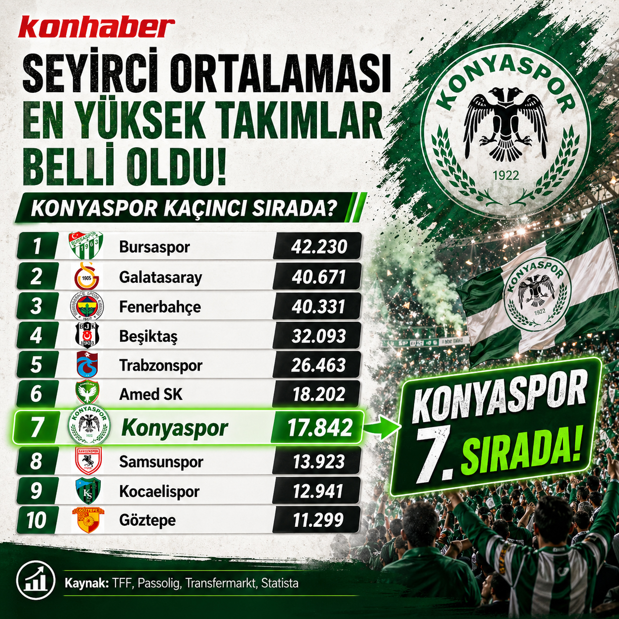 Türkiye Futbol Federasyonu’nun resmi maç raporları ve stadyum giriş istatistiklerinden derlenen verilere göre Konyaspor, 2025-2026 sezonunda 17 bin 842 seyirci ortalamasıyla listenin 7. sırasında yer aldı.