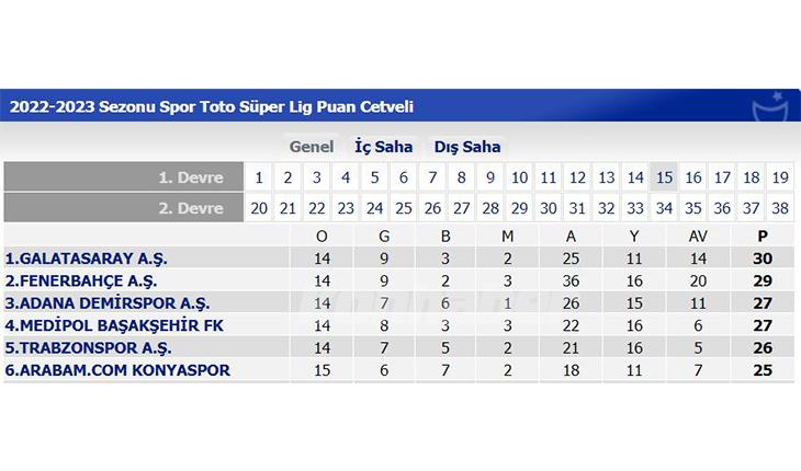 Spor Toto Süper Lig'de 15. hafta maçlarının ardından oluşan puan durumu şöyle: