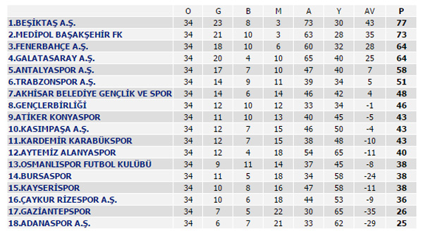 Spor Toto Süper Lig'in 34. haftasında alınan sonuçlar ve puan durumu şöyle: