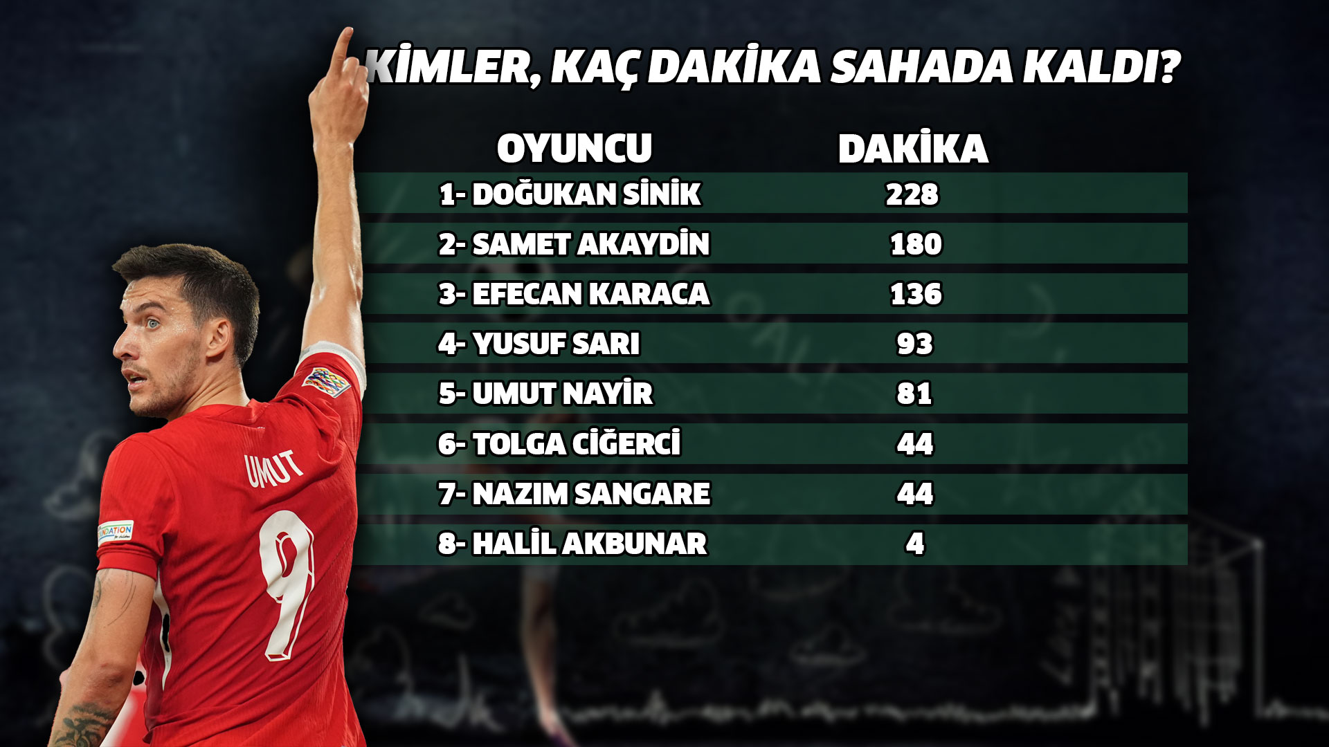 Anadolu’dan milli takıma giden 8 futbolcu, bahse konu periyotta sadece 807 dakika sahada kaldı. 228 dakika sahada kalan Doğukan Sinik bu alanda zirvede yer alırken, 180 dakika sahada kalan Samet Akaydin ise 2. sırada kendisine yer buldu. Listenin devamında 136 dakika ile Efecan Karaca, 93 dakika ile Yusuf Sarı, 81 dakika ile Umut Nayir kendilerine yer buldu. 44’er dakika sahada kalan Tolga Ciğerci ve Nazım Sangare’nin devam ettirdiği liste 4 dakika forma şansı bulan Halil Akbunar ile sona erdi.