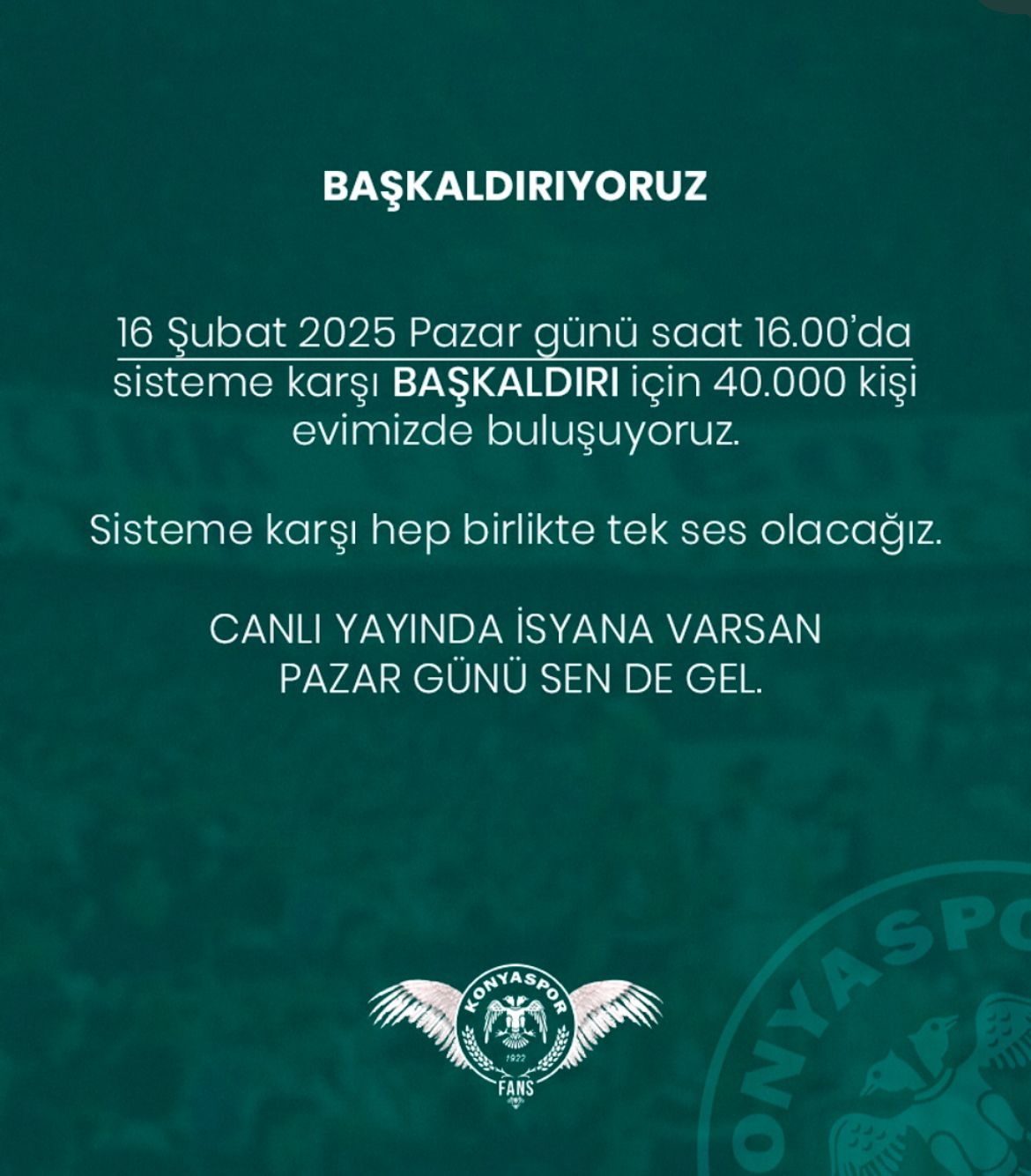 Konyaspor'un taraftar sayfalarından ise 16 Şubat 2025 Pazar günü Süper Lig'in 24.haftası kapsamındaki Samsunspor mücadelesinde, "Sisteme karşı hep birlikte 40 bin kişi evimizde buluşuyoruz" mesajıyla bir araya gelmeyi planlıyor.