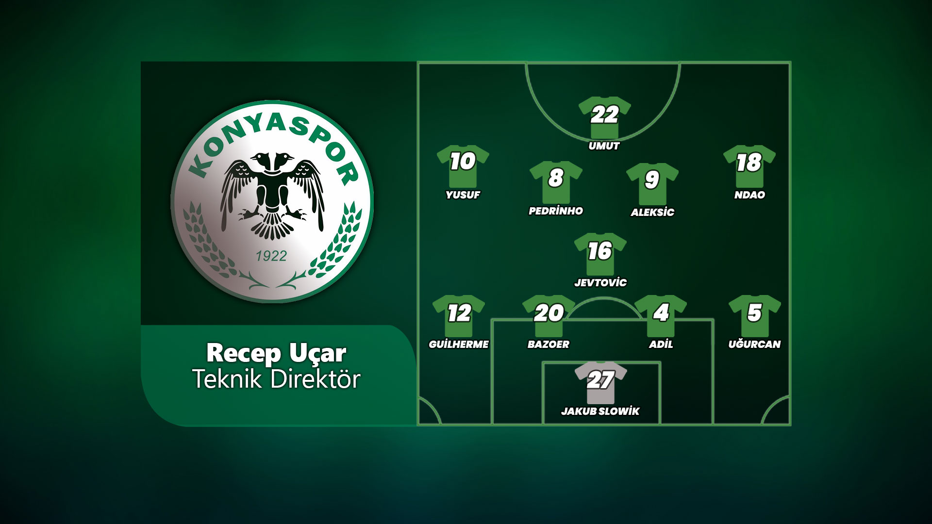 Teknik direktör Recep Uçar nezaretinde 4-1-4-1 dizilişiyle mücadele eden Tümosan Konyaspor’un, Alanyaspor maçında da aynı sistemle sahada yer alması bekleniyor. Yeşil-beyazlıların kalesinde Jakub Slowik (27), savunma 4’lüsünde Uğurcan Yazğılı (5), Adil Demirbağ (4), Riechedly Bazoer (20) ve Guilherme Sitya (12), tekli ön liberoda Marko Jevtovic (16), 4’lü orta alanda Alassane Ndao (18), Danijel Aleksic (9), Pedrinho (8) ve Yusuf Erdoğan (10), tekli forvette ise Umut Nayir’in (22) forma giymesi bekleniyor. (Büşra Üstündağ)