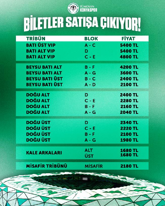 Yeşil beyazlı kulüpten yapılan açıklamada Galatasaray maçı için 18 Nisan Cuma günü saat 15.00’e kadar sadece Konyaspor Passolig kartı sahiplerine bilet satışı olacağı ve belirtilen tarih ve saatin ardından diğer takım logolu Passolig kartı sahiplerine bilet satışı açılacağı duyuruldu.