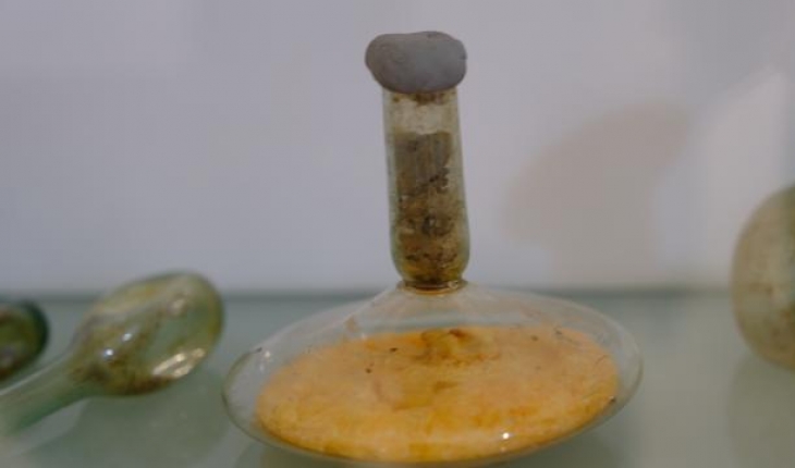 Yapılan incelemede M.S. 3 veya 4'üncü yüzyıllara ait olduğu tahmin edilen cam fanusun içindeki sıvının zeytinyağı olduğu ortaya çıktı.