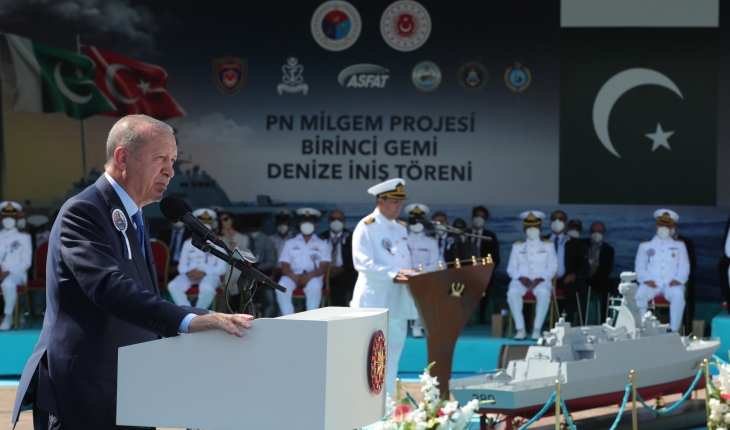 Cumhurbaşkanı Recep Tayyip Erdoğan, Pakistan MİLGEM Korvet Projesi 1'inci Gemi Denize İniş ve Açık Deniz Karakol Gemisi Projesi 1'inci Gemi Sac Kesim Töreni'nde konuştu.