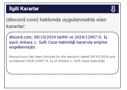 Bilgi Teknolojileri ve İletişim Kurumu Site Bilgileri Sorgu Sayfası'nda yer alan bilgiye göre Discord uygulaması Ankara 1.Sulh Ceza Hakimliği kararıyla erişime engellendi.