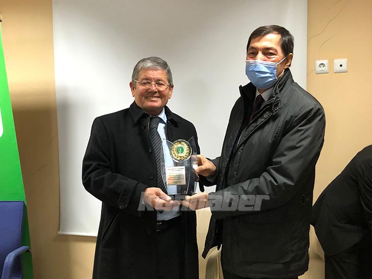 Konuşmaların ardından Onursal Başkan seçilen Mehmet Erol Sözen’e plaketini Prof. Dr. Behiç Coşkun verdi.
