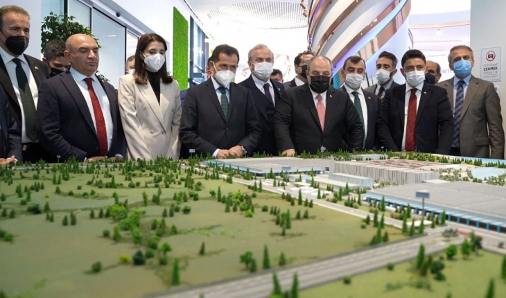 TOGG CEO’su Gürcan Karakaş, Bakan Varank ve komisyon üyelerine Ar-Ge çalışmaları hakkında TOGG’un Gemlik’teki fabrikasının maketi önünde bir sunum yaptı.