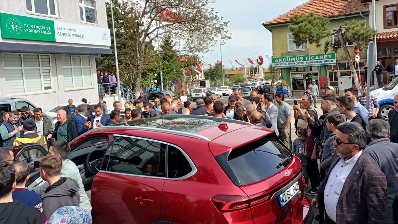 Togg'u yakından görmek isteyenler, pazar yerinde aracı inceleyip, hatıra fotoğrafı çektirdi.Hüyük Belediye Başkanı Mehmet Çiğdem, "Yapamazlar edemezler' dediler. Alın size yerli otomobil Togg." dedi.