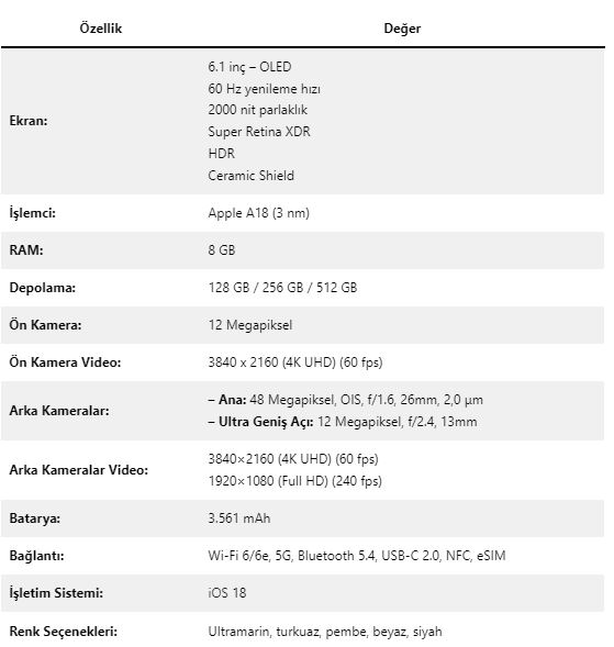 iPhone 16 tüm özellikleri: