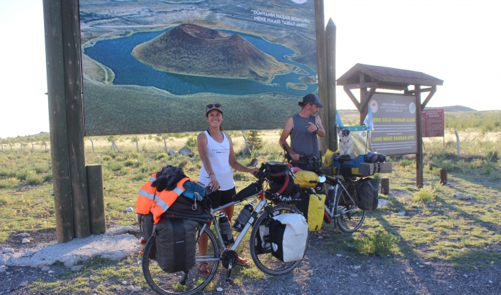 Bisikletle dünya turuna çıkan Arjantinli çift Karapınar'da Meke krater gölünde kamp kurdu.