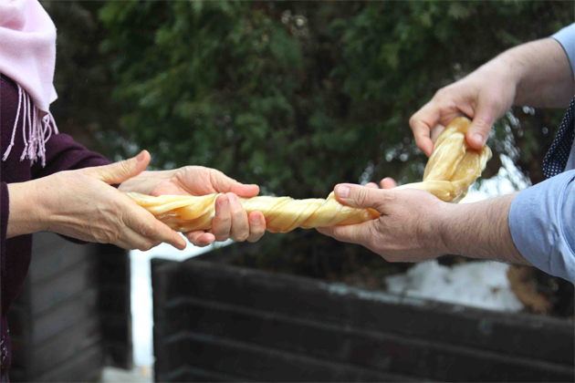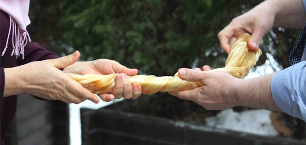 "Şerbetin istediğimiz kıvama gelmesi için tepsinin kar üzerinde durması gerekiyor. Alttan vuran kar soğuğu şerbetin istediğimiz şekilde olmasını sağlıyor. Başka bir tepsiye yaydığımız unun içerisine hamur kıvamına gelen şerbeti bırakıyoruz. Ardından tepsinin etrafına 7 kişi toplanıyoruz. Halka halinde hamuru çekerek uzatıyoruz. En az 18 kez bunu tekrarlıyoruz. Tel tel olduğunda kıvamına gelmiş oluyor. Çekilerek yapıldığı için de adı çekme helvadır."