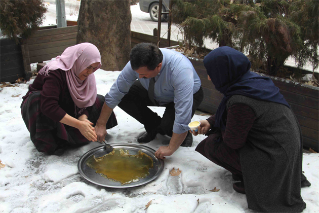Kıvamını ayarladıktan sonra şerbetin kar üzerine bırakılan büyükçe bir tepsiye döküldüğünü belirten Demir, şu bilgileri verdi: