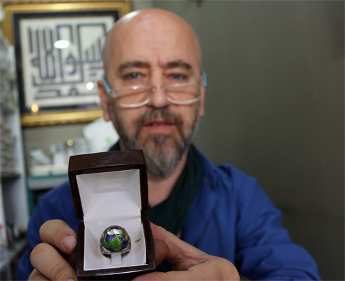 Konya’da bir tasarımcı Cumhurbaşkanı Recep Tayyip Erdoğan için özel olarak tasarladığı ve üzerinde “Dünya 5’den Büyüktür” yazısı bulunan özel tasarımlı yüzüğü Cumhurbaşkanı Erdoğan’a vereceği günü bekliyor.