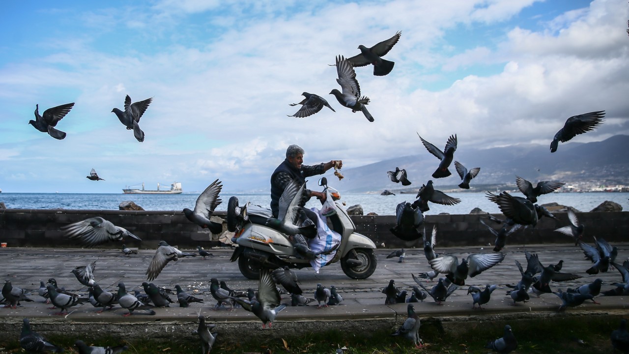 Hatay'ın Belen ilçesinde yaşayan 62 yaşındaki Hasan Öztep, 6 Şubat'ta meydana gelen depremler nedeniyle en tenha günlerini yaşayan İskenderun sahilinde, aç kalmalarından endişe ettiği yüzlerce güvercin ve martı için her gün buğday ve ekmek getiriyor.