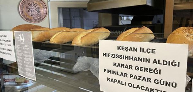 'Çok yüksek risk' bölgesi olan Keşan ilçesinde, Hıfzıssıhha Kurulu, sokağa çıkma kısıtlamasının uygulandığı pazar günü vatandaşların bahanesinin azaltılması için fırınların yarın ve 21 Mart Pazar günü ekmek üretmemesi kararı aldı.