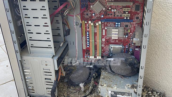 Aksaray'da, bir evin balkonunda unutulan bilgisayar kasasına güvercinler yuva yaptı.