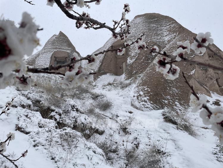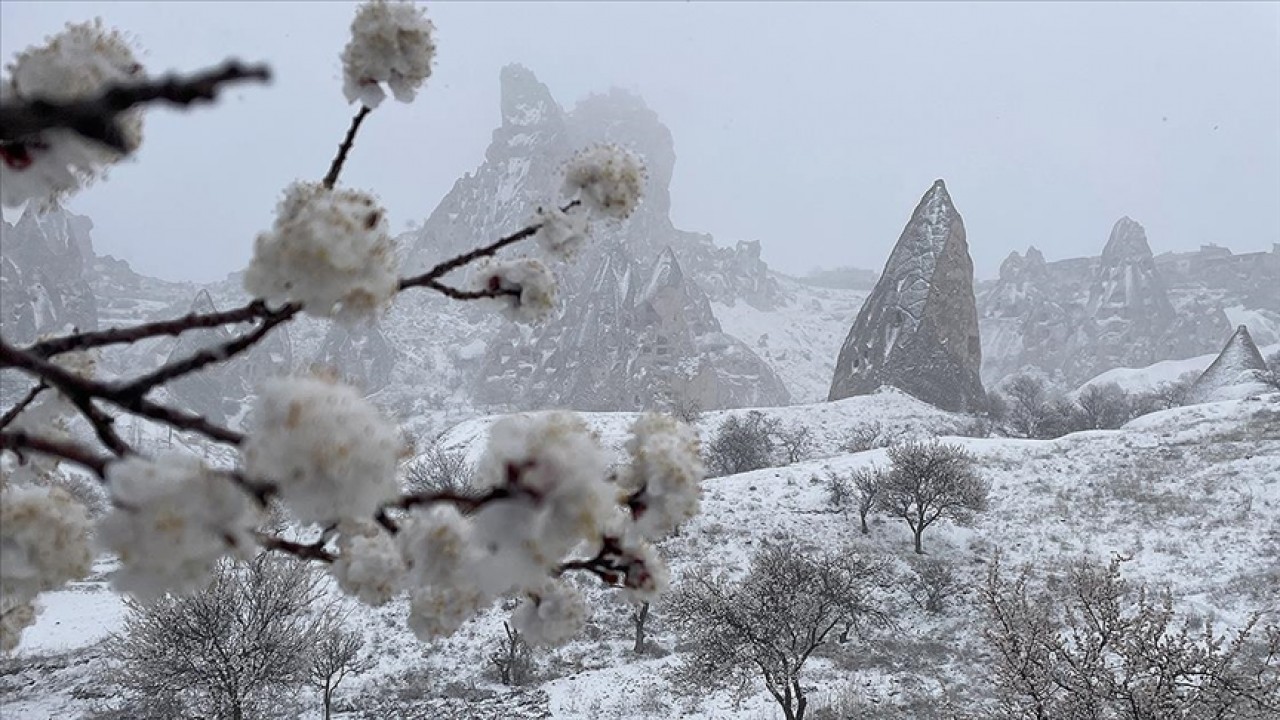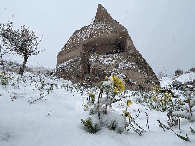 İlkbaharın gelişiyle açan çiçekler ile kar, Kapadokya'nın manzarasına farklı bir görünüm kattı.Bölgede, sabah saatlerinde müze ve ören yerlerini ziyaret eden turistler, hava sıcaklığının sıfırın altına düşmesi ve kar yağışının başlamasının ardından vakitlerini konaklama tesislerinde ve kapalı mekanlarda geçirdi.